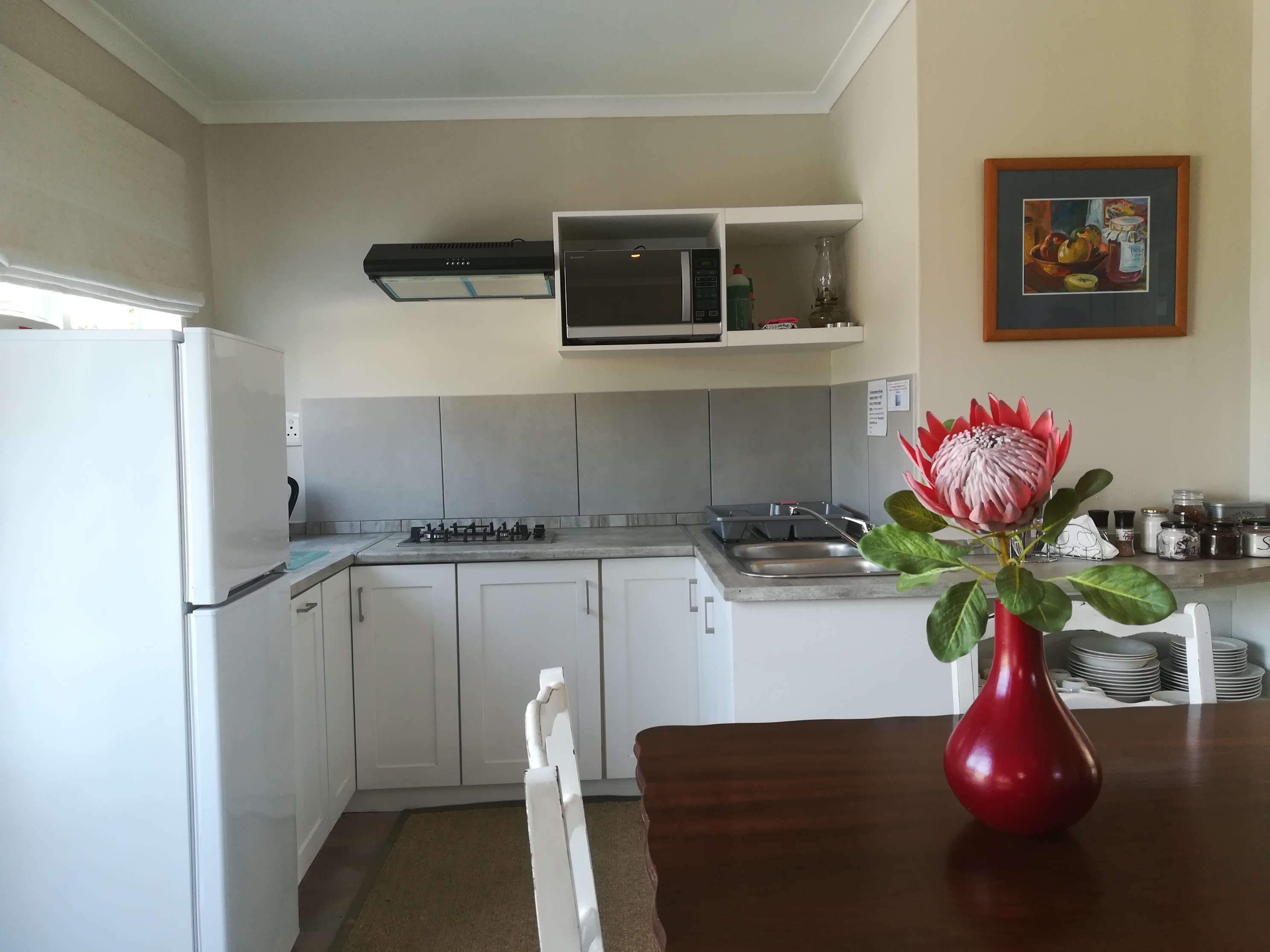 The newly renovated kitchenette offers self-catering in the form of a fridge, convection mini oven, microwave, toaster and kettle, electric frying pan, egg boiler and gas hob for light meal preparation or warming up take-out meals. There is a gas grill braai on the deck.